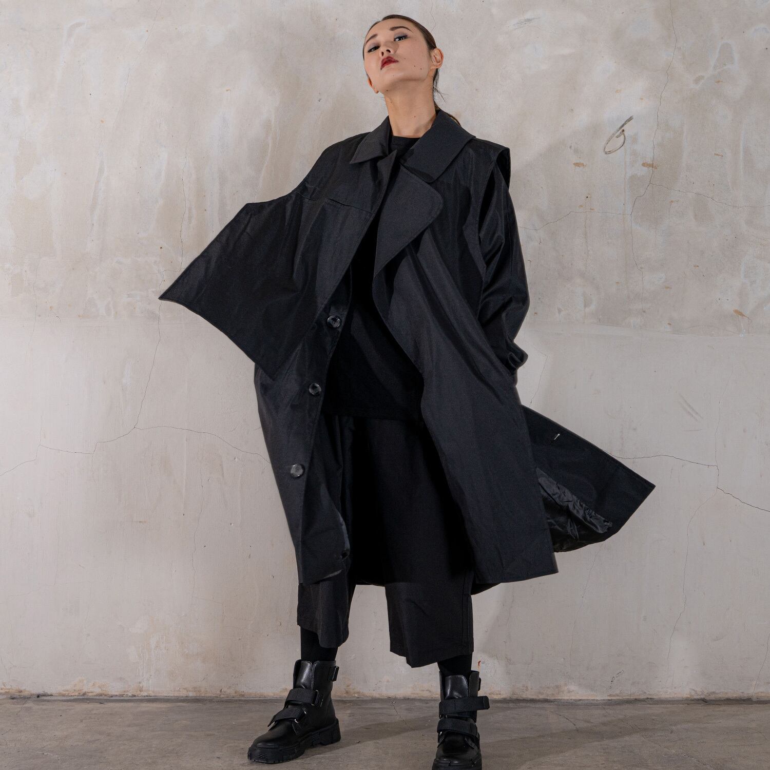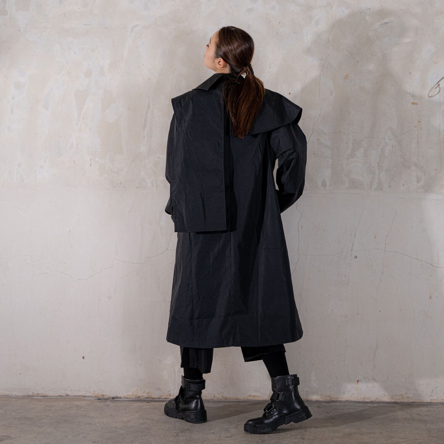 シャリ感のあるコットン生地を採用しエレガントな表情を演出する個性的なロングコートが到着しました。
